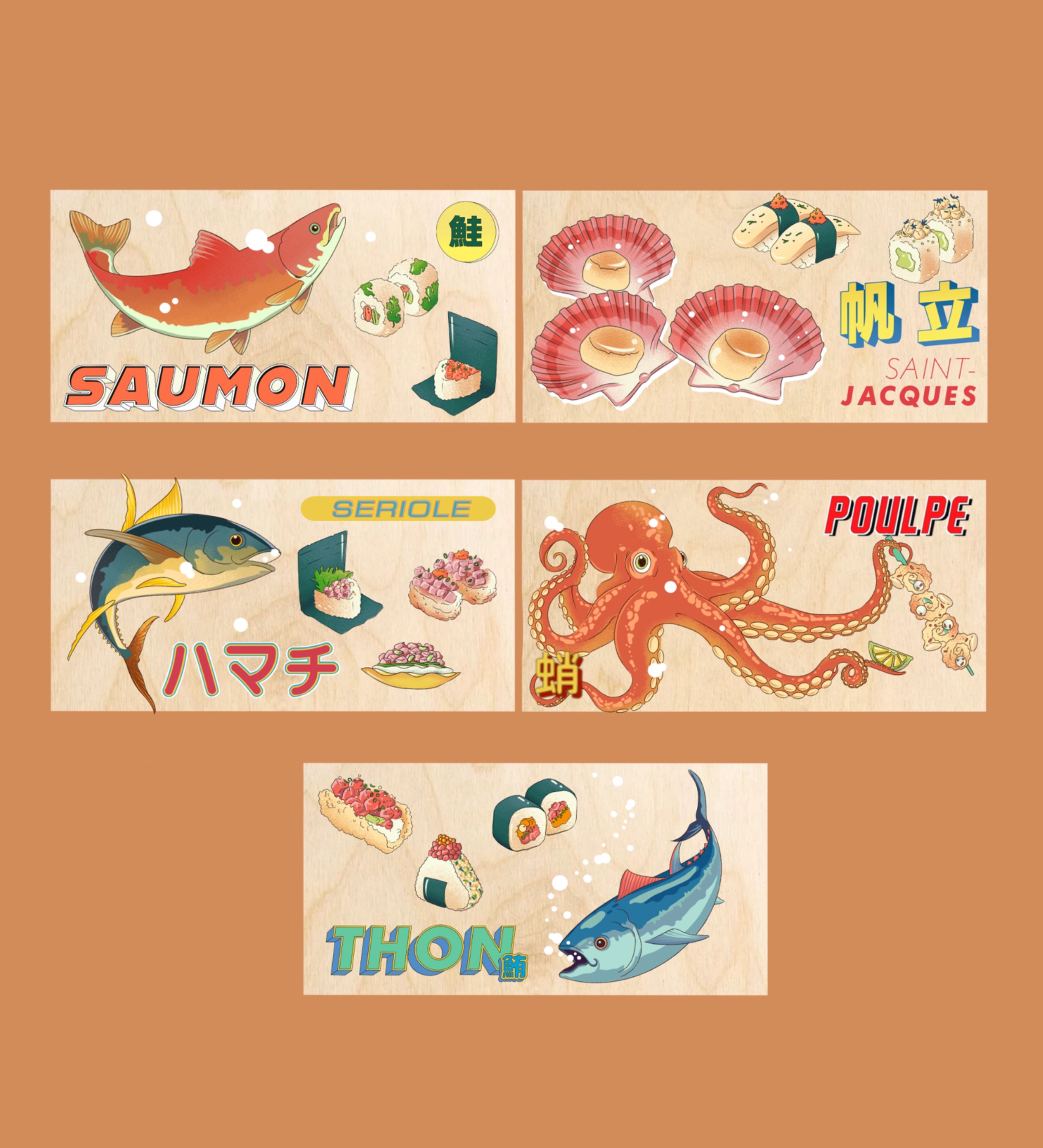 Hand-printed on beachwood using layered acrylic, these illustrated panels celebrates the ritual and poetry of Japanese cuisine through a contemporary, graphic lens. Commissioned by Nightflight Studio for Matsuri Courcelles, Paris, where it is currently on display, the work blends culinary iconography with a vintage, japanese sensibility.